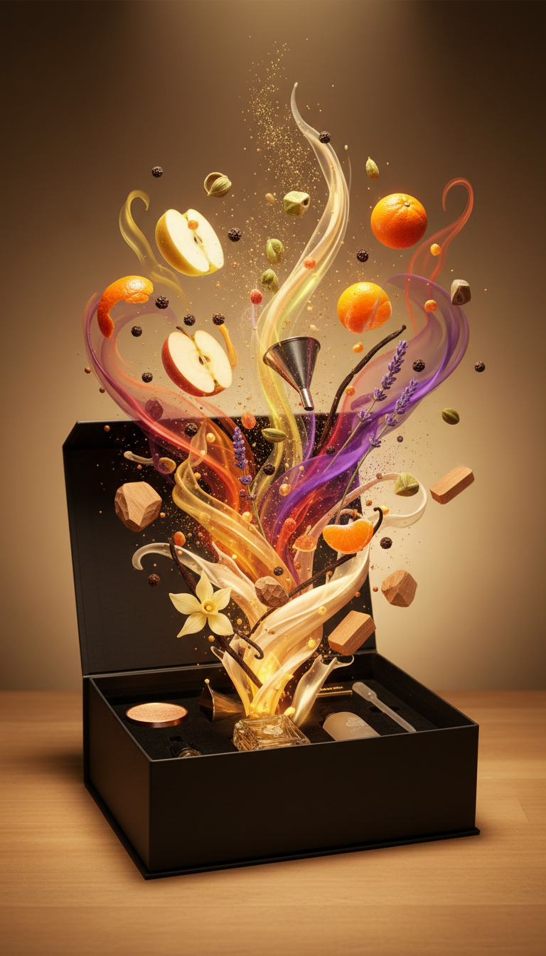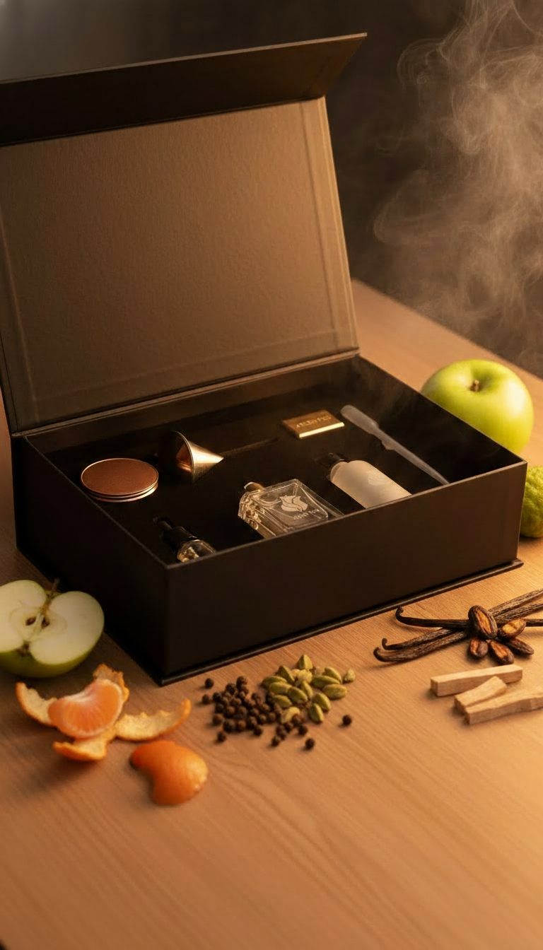 VELVET SPICE, meyvemsi ferahlık ile baharatlı sıcaklığı; vanilyalı, kremsi ve yumuşak bir zemin üzerinde buluşturan premium bir parfüm hazırlama kitidir.