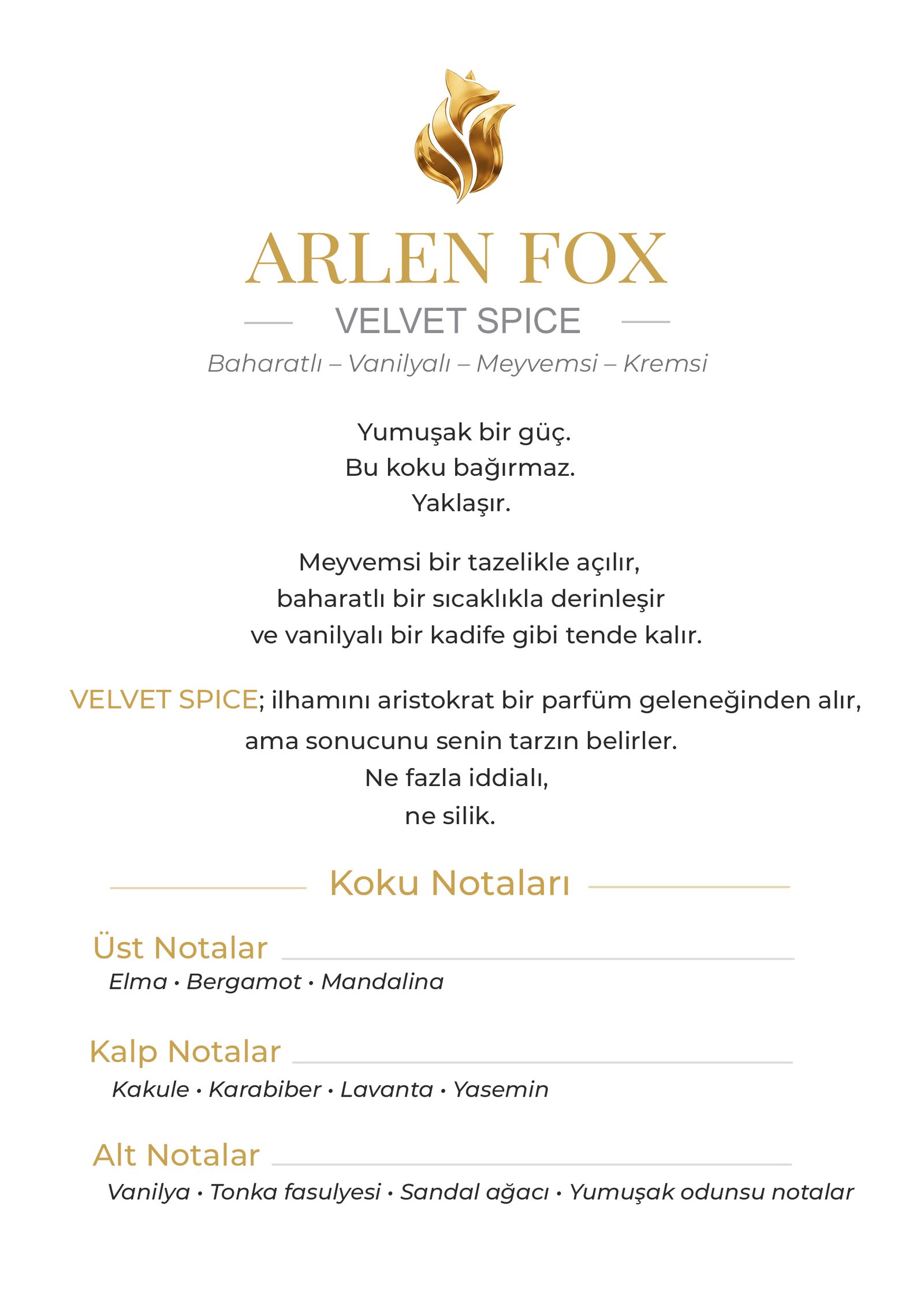 Bu katman, kokunun sıcaklığını ve karakterini belirlerken VELVET SPICE’a net bir duruş kazandırır. Baharatlar sertleşmeden, yumuşak bir geçişle kremsi yapıya bağlanır; koku dengeli ve sofistike bir çizgide ilerler.
